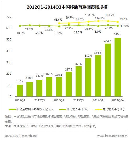 艾瑞咨詢(xún)數(shù)據(jù)顯示,2014年第三季度中國(guó)移動(dòng)互聯(lián)網(wǎng)市場(chǎng)規(guī)模達(dá)到515.6億元,環(huán)比增長(zhǎng)11.0%,同比增長(zhǎng)93.4%。