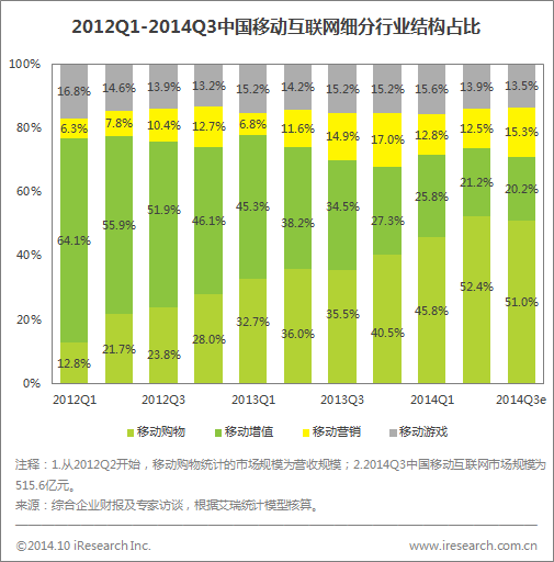 艾瑞咨詢(xún)數(shù)據(jù)顯示,2014年第三季度移動(dòng)購(gòu)物占比達(dá)到51.0%,移動(dòng)增值占比為20.2%,移動(dòng)營(yíng)銷(xiāo)占比15.3%,移動(dòng)游戲占比13.5%。移動(dòng)購(gòu)物占據(jù)移動(dòng)互聯(lián)網(wǎng)經(jīng)濟(jì)半壁江山;移動(dòng)增值進(jìn)一步受到其他細(xì)分領(lǐng)域的排擠,占比持續(xù)降低;由于移動(dòng)廣告平臺(tái)開(kāi)始出現(xiàn)分化,程序化購(gòu)買(mǎi)產(chǎn)業(yè)鏈初步形成,新的移動(dòng)廣告投放方式刺激移動(dòng)營(yíng)銷(xiāo)市場(chǎng)實(shí)現(xiàn)新的增長(zhǎng)。