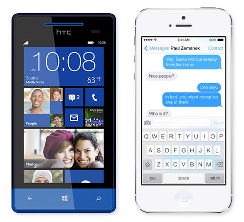 Windows Phone 8 及 Apple iOS 7 界面。