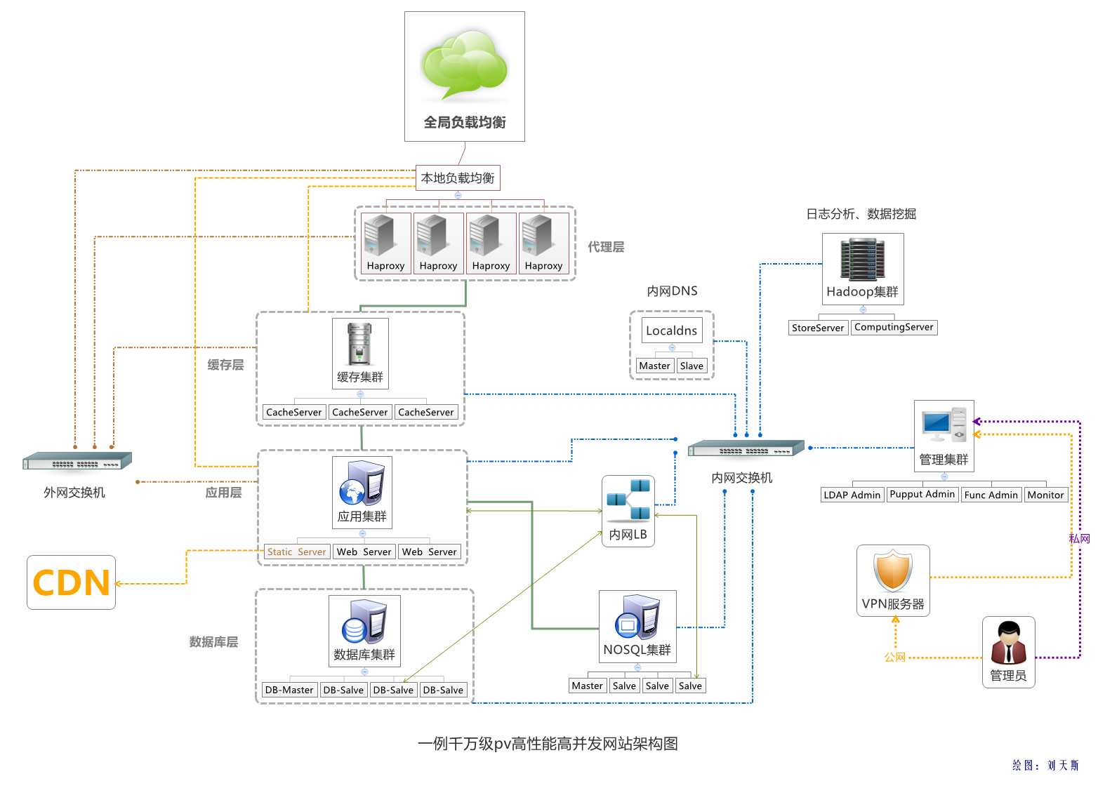 一個(gè)支撐千萬級(jí)PV的網(wǎng)站是非??简?yàn)一個(gè)架構(gòu)是否成熟、健壯(本文不涉及軟件架構(gòu)的層面,有興趣也可以討論)?,F(xiàn)拋出一個(gè)系統(tǒng)層面的架構(gòu),不保證是最優(yōu)的方案,但也許適合你。理由是再優(yōu)秀的架構(gòu)都不具備通用性,需要根據(jù)每種應(yīng)用特點(diǎn)針對(duì)性來設(shè)計(jì)。